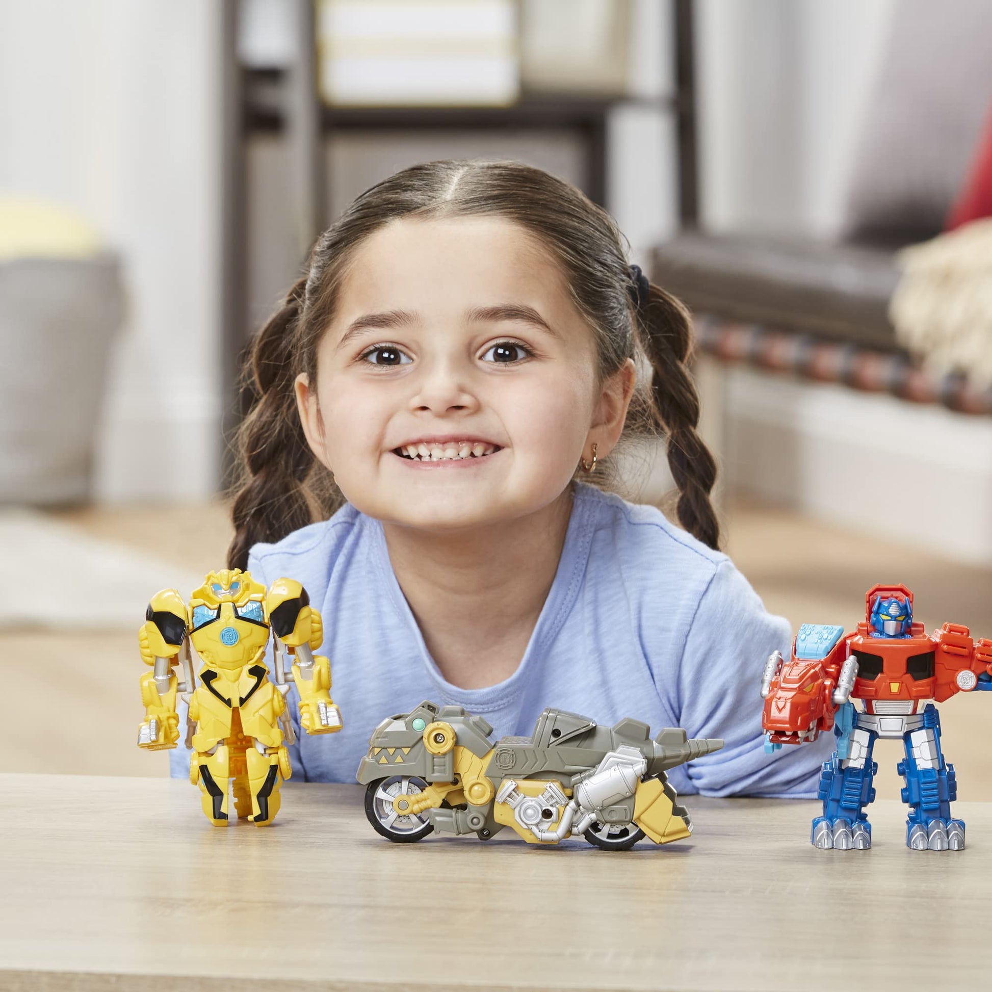 - 2-IN-1 TOYS: Little heroes can enjoy twice the fun with 2 play modes, converting the Optimus Prime figure from robot to T. Rex mode, Bumblebee figure from robot to velociraptor mode, and Grimlock figure from T. Rex to motorcycle mode and back again